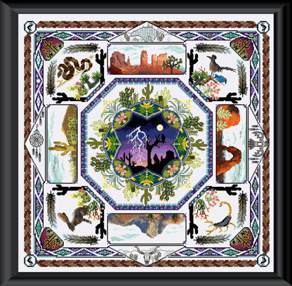 Design size of this piece is 316 x 316 stitches. Here you can stitch a collection of impressive pictures of desert landscapes animals and flora. Typical colors of the South-West USA together with stylisized patterns of Native Americans give a warm and ôdesert-yö feeling.