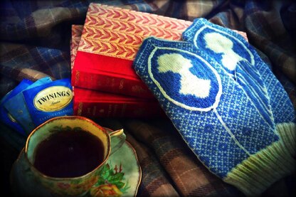 These colourwork mittens feature cameos—those most classic Regency silhouettes—of a young lady and her fine gentleman gazing at each other. The silhouettes are framed with cabled ovals, worked with the contrasting colour against the main/background colour. The cables give an unexpected hint of texture to the stockinette-stitch mittens and add a little extra challenge for the knitter. In the background are diamond and stripe patterns inspired by historical wallpaper patterns. A deep cuff of twisted-stitch ribbing keeps the mittens snug and practical.