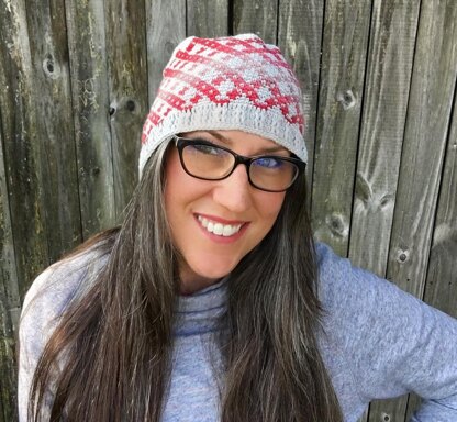 Using the Fair Isle technique this beanie will fit all ages and can be made in all colors. Use solid color yarn instead of self-striping for a much more subtle effect.