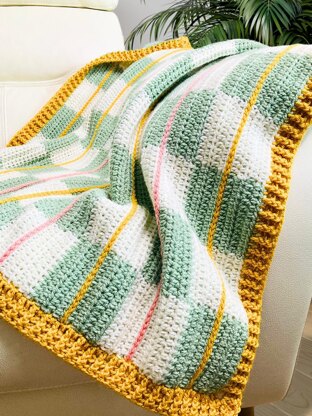 This pattern features a striking checkerboard design made from simple colour blocks, with bold pinstripes added using surface crochet for extra visual impact. A clean ribbed border finishes it off beautifully, adding structure to the fun design.