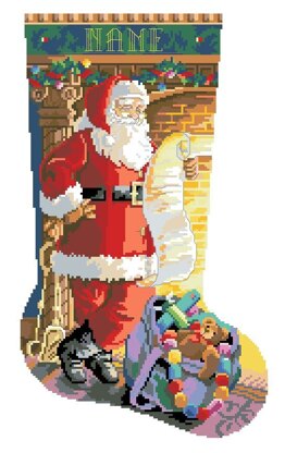 Designed by: Nancy Rossi. Jolly Santa is checking his list before getting ready to deliver the gifts and toys to all the good girls and boys in the world. Adorn your home with holiday cheer with this cozy, classic Christmas stocking. The vintage-inspired design would give a nostalgic touch to any holiday dГ©cor and brighten any Christmas mantel. It pairs well with our extensive Kooler classic stocking collection.\n