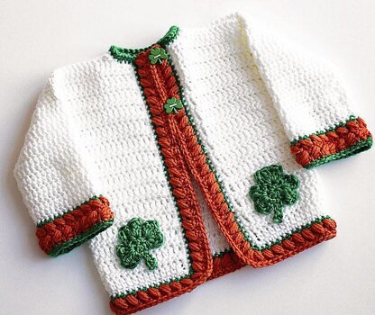 This sweater has clean simple lines, and a textured border with an option for a long or short sleeve. The closure can be done with buttons, hooks/eyes or even a zipper. The pattern also includes two fun embellishments, a flower and a shamrock. Pair it up with the Cherise Hat and Purse for a complete set! Make this one in many colors!