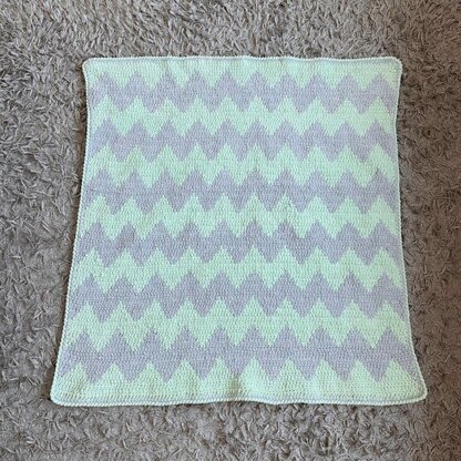 The pattern has both a written tutorial and chart for reference, with notes on customizsing to four different sizes. The blanket shown in the photos is a stroller size, using 8 balls of super chunky yarn; 4 in each colour.