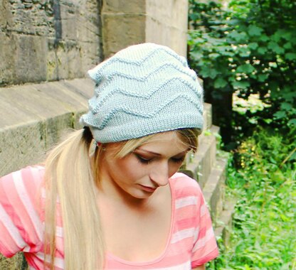 An slightly slouched beanie hat worked in the round. The brim is a folded hem with purl bump. A purled pattern creates the zig zagging line throughout. The crown decreases in a crossed section. Chicane is named after the zig zagging pattern.