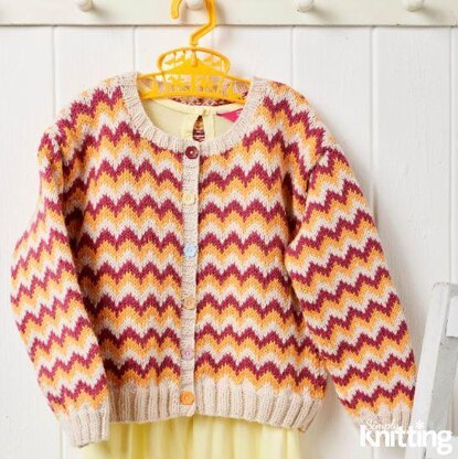 This is a pattern for a children's chevron cardigan, originally published in Simply Knitting. It is worked in a Fair Isle pattern, with 2 x 2 rib edges. Different coloured flower shaped buttons are used on the sample. Photos Simply Knitting.