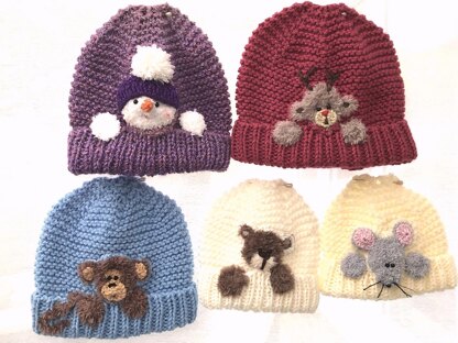 This listing is for a instant download knitting pattern for a children's motif hat. These are a fun quick knit. What I would call TV knitting. You can cast on and just knit while watching TV. Lovely as a stocking filler for little ones. Motifs included: Bear, Reindeer, Mouse, Monkey and Snowman.