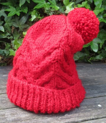 A twist on the usual cable patterned hats - here is a child's bobble hat, knitted in soft Aran yarn, with a cabled pattern that looks a little different. perfect for toddlers and pre-teen children.