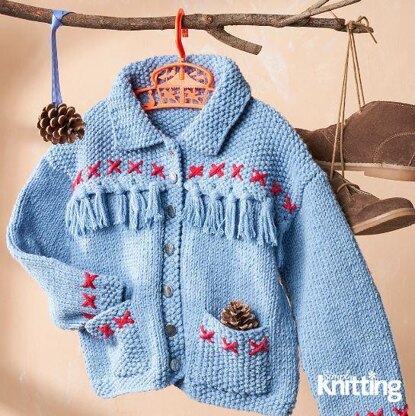 This is a pattern for a child's denim style jacket, originally published in Simply Knitting. It is knitted in stocking stitch and moss stitch, with embroidery and a fringe added to decorate. Photo Simply Knitting.
