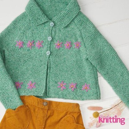 This is a pattern for a child's garter stitch and flowers cardigan, originally published in Simply Knitting. It is in garter stich with a sticking stitch yoke, with embroidered flowers. It is fine for a beginner able to pick up stitches for the collar. Photo Simply Knitting.