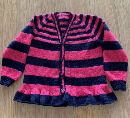 This is a simple, Top Down, 'V' Neck Cardigan for children. This one has ruffles around the hem but ribbing or garter stitch could be used