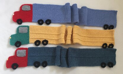 A cute novelty scarf for boys and girls! Ours measures approximately 34 inches long. You can make it a little longer if desired . An easy project, that can be made in two days or less. Knits up with worsted weight yarns, (a size 4 yarn) and knitting US # 8, plus US # 6 . Boys love to cuddle and play with this on car trips, and girls love it too. Make several scarves in different colors using up your scrap yarns for a great gift for children!
