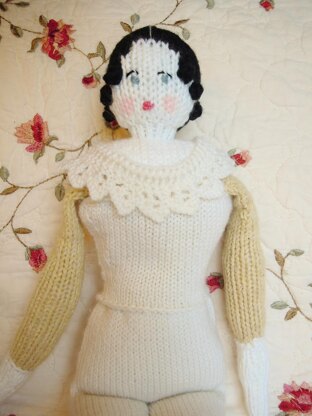 This PDF includes instructions for her underwear (a chemise and pantalettes) which are edged with vintage lace. A Victorian Walking Suit for her to wear is available from my Ravelry designer page.