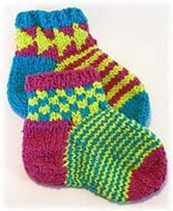 These are a quick knit in DK-weight yarn, and the colorwork keeps you fascinated. The patterns are easily memorized, and the knitting just speeds right on by. Three colors of yarn can be combined in infinite ways with six leg charts and four foot charts. Much fun, more color!
