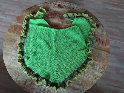 Sample knitted with 2 skeins of solid color in the body and one skein of multicolored yarn in the ruffled border.