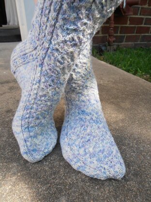 The sock is worked cuff down with mock cables and twisted stitch panels. The panels and mock cables are separated by purl stitches. Additional purl stitches may be added to increase the size, if needed.