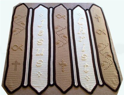 This lovely inspirational afghan is made from Red Heart With Love acrylic worsted weight yarn, soft to the touch. Afghan is done in strips then sewn together and finished off with a border. Finished afghan measures approx. 64” L x 66 1/2” W. Stitches - sc, hdc, dc, tr.
