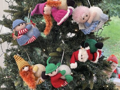 This pattern includes the directions for the bauble cover and 6 characters, Santa; Fairy; Gnome; Elf; Girlie Gnome; and Girlie Elf. You will need 8cm polystyrene baubles, double knit yarns, 3mm straight needles for the bauble cover and 2.5mm straight knitting needles for the characters, 8mm toy safety eyes, and toy safety stuffing.