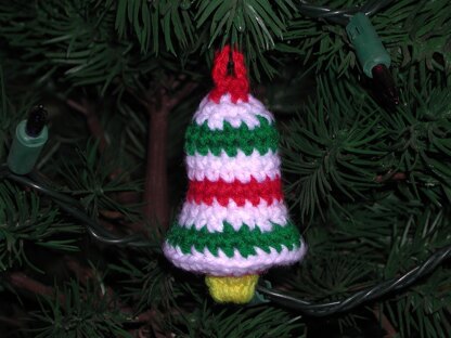 This cute little Christmas bell will add a touch of nostalgia to your Christmas tree. Of course, it is kid- and pet-proof and washable, if made with synthetic yarn. You can make it all in a solid color, if you desire. It is made with scraps of worsted weight yarn. It is one of a series which I have designed.