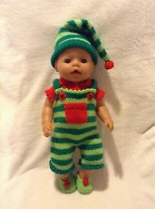 A festive Christmas Elf costume knitting pattern to fit a 15-18 inch doll (eg. Baby Born).
