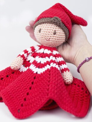 The Christmas Elf lovey is 15 inches in diameter using worsted weight yarn. Written in American English crochet terms.