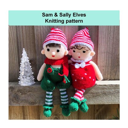 Christmas boy and girl elves Sam & Sally. They both measure approximately 30cm (12 inches) from the feet to the top of their hats. Knit flat on two needles and seamed and are very easy to follow with clear instructions and photo.