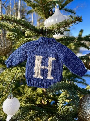 This pattern uses two colours of sock yarn knitted double-stranded, one colour for the base and an accent colour for the letter. You’ll only need to purchase one 50 gram skein of each colour and divide them in half into two cakes. The pattern is for a mini raglan sweater, knitted top down with a folded collar and colour work letter on the front. There is a photo tutorial on how to twist metal wire into a mini hanger for your sweater ornament. Colour work charts for the whole alphabet are included so you can personalize it!