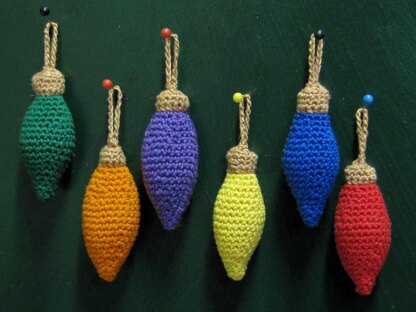 Ornaments work out to just about 2 inches long, the same size as the old fashioned "C7" style Christmas lightbulbs, with which my husband's family traditionally decorated their tree. Any colors of your choice may be used, and there is an optional garland version.
