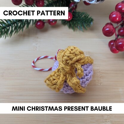 Christmas decorations are always fun to make and gift but this pattern is extra cute! The mini Christmas present bauble comes together very fast and it could be a great project for using yarn scraps. It measures just under 2×2 inches.