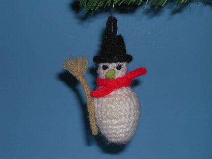 This adorable little snowman will look great on your Christmas tree. It is made with scraps of worsted weight yarn and a small amount of Dacron stuffing. I designed a whole series of these, because I adopted a cat who loved to climb the Christmas tree. Obviously, they are pet- and kid-proof and washable, too.