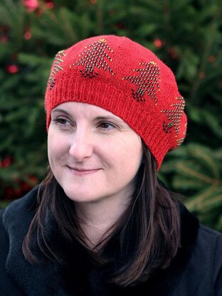 This is a slouchy beret, knitted in the round and worked in one piece from the bottom up. After casting on using a long tail tubular cast on method for 1x1 rib, the brim is worked before commencing onto a beaded section to knit the Christmas tree motifs. This is then followed by the crown shaping of the beret and an I-cord finish.