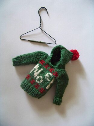 This pattern is for a 4-inch tall hooded pullover sweater with a "Noel" design. It is intended as a Christmas tree ornament, but it also makes a good decoration for a Christmas present. It hangs on the tree on its own little clothes hanger - directions included. This is a great way to use leftover sock yarn. I like miniature things, and have had fun making these - 200 and counting!