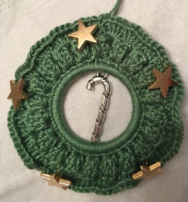 This is a pattern for a Christmas tree decoration: a wreath. The finished size is approximately 6.5cm across. It is worked into a 30mm solid ring. Instructions are given for placing 4mm beads or shank buttons.