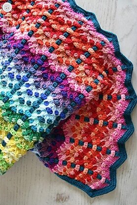 Made with 22 different colors of Scheepjes Merino Soft for the [Design Wars Challenge][1], this blanket looks like a colorful cobblestoned street. Sized for a baby blanket, it can be adjusted in size using the included multiples. And the woven strips are simple and portable for on-the-go crochet. The weaving strips are simple to weave according to included instructions and make for a textured and squishy blanket.