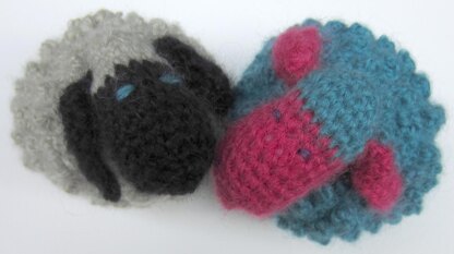 This rotund sheep is fun to play with and simple to make. The round shape and textured bottom allow it to “sit up” without legs. Optional instructions are included to transform the sheep into an ornament or hanging decoration. Updated June, 2018.
