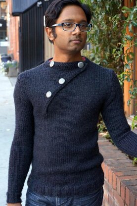 Chum's Pullover is knit in bulky yarn, making relatively short work of a man-sized garment. The piece would look great with a pair of jeans, battered and old or crisp and sleek. It would also pair well with a pop of colour like red denim, if that's the way you roll.