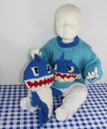 This is my Chunky Baby and Toddler Shark Sweater and Toy knitting pattern. My grandson Gus LOVES this sweater and toy. He pulls the sweater into his cot and cuddles it in his sleep. The sweater has the full shark on the back and the shark face on the front as can be seen in the photos. The sweater is worked flat mainly on 6 mm needles in any chunky yarn of your choice. The knitting pattern provides full instructions for 4 sizes S (6-12 months), M (12-18 months), L (18-24 months) and XL (24-36 months). There are step by step photos to help you throughout and colour charts for the intarsia work. The toy shark is 14 inches and worked flat on 4 mm needles in the leftover chunky wool from the sweater. This set makes a fabulous gift for any baby or toddler. You can buy this madmonkeyknits pattern here as an immediate pdf download.