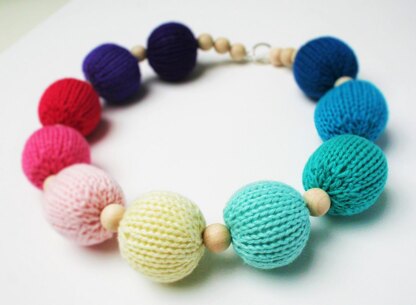 Materials: 2 knitting needles (US3/3.25mm or as per tension advice), 5-10g cotton light worsted or DK yarn (e.g. Paintbox Yarns Cotton DK) per knitted bead, 15 x 12mm unvarnished wooden beads, 40-50g of polyfil toy stuffing, 1m of embroidery floss, Necklace clasp, 1 tapestry needle for finishing Techniques: Cast on, Cast off, Increase, Decrease Stitches: Stocking stitch