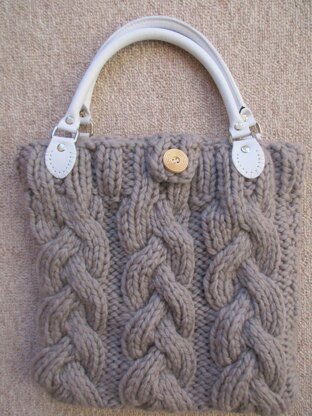 This is a pattern for a chunky cable bag, originally published in Knitting magazine. It has a simple plaited cable, and is quick to knit in a chunky yarn. It has fabric lining, and bought faux leather handles. It is finished with a button and press stud.