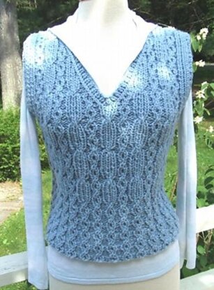 About The Design: This vest comes in 4 sizes and is knit in an unusual yarn: Bollicine Revolution**, which** has high yardage, for its grist, so makes a lighter-weight garment than other yarns of this thickness – a chunky wt, despite having aran wt. yardage.