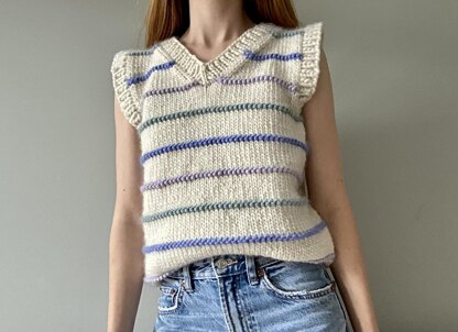 Chunky Stripe V Neck Vest Knitting Pattern. Colourful knitted stripe detailing with ribbed neck and armhole trims. Comfy and relaxed fit. Easy beginner-friendly knitting pattern.