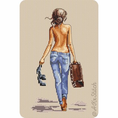Modern Woman Counted Cross Stitch "Ciao Bella". Easy to Follow Embroidery Chart featuring a gorgeous sexy girl on holiday in Follow Me Style art. Great handmade gift idea for any strong independent feminist girlfriend or make your own MeToo statement wall decor. \n\nSize: 68w x 124h stitches\nStitched on Aida 14ct: approx 12 x 23 cm (5 x 9 in)\nDMC Threads: 25 solid colours (5 blends)\nUsed stitches: full cross stitch, half cross-stitch, backstitch\nSkill level: Easy / Beginner\nStitch time: 18-25h\n\nCross stitch pattern in PDF, Instant Digital Download includes: 1) cover page with preview; 2) instructions, symbols key and shopping list (DMC thread colour numbers and estimates, as well as fabric options); 3) two black and white charts, with and without backstitch; 4) two colour charts, with and without backstitch; 5) single page PDF for Pattern Keeper (available on request).\n\nPlease note: This pattern is for personal use only - not for commercial use. You can't make copies of our charts to distribute (either as PDF or printed versions) but you can definitely sell your finished cross stitch work.