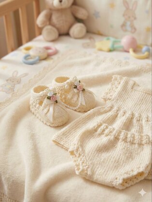 The matching bonnet is knitted from the brim up and the icords ties are knitted and attached to the neck edge to finish, so again you just sew the back seam. The pretty shoes are easy to make and complete the outfit.