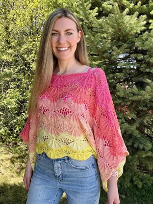 The Citrus Summer Sweater is a perfect, lightweight cover-up designed in Moonglow Yarn Co's beautiful Lemonade Fade. This design is inspired by all the wonderful aspects of summer—such as refreshing cocktails, strawberry lemonade, sunsets, citrus fruits, beach vacations, poolside days, sunny weather, and warm breezes. It has a fluttery and airy feel, featuring a lace pattern that I’ve named Summer Citrus because it reminds me of lemon slices.