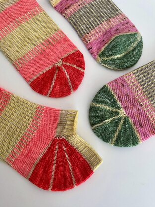 Sock begins at the side of the toe with a crochet provisional cast on. Toe is worked flat using short rows, then stitches are picked up from the provisional cast on and the edges of work. Sock then proceeds upward in the round. The short row heel has extra height to raise the back of the heel before finishing with a brief cuff. Sample socks are size 3. Yarn used in sample socks is Less Traveled Yarn, 757 Sock Minis. Orange socks are A/Gossip Column, B/Desert Marigold, C/Spicy Salmon, D/Halston. Green socks are A/Saguaro, B/Desert Marigold, C/Cactus Flower, D/Barley