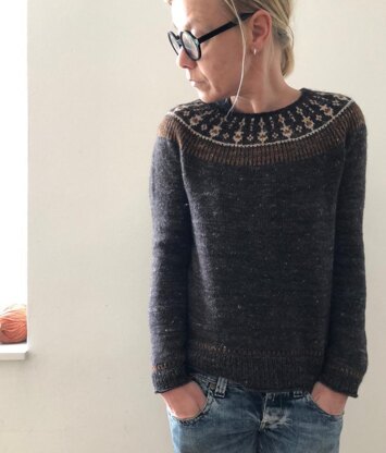 Clapton is worked seamlessly from the top down. First some short rows are worked back and forth to create a higher back neck and then the yoke is worked in the round to sleeve separation. Some last short rows are worked to finish the yoke shaping right before sleeve stitches are placed on hold. The body is then worked in rounds down to the hem. Sleeves are worked top down to the cuffs last. Optional neck finishing is worked last.