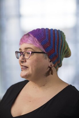 This is a sassy, bouncy, spiral hat knit flat on the bias and kitchener stitched together. It is totally reversible, and I recommend knitting it in long gradient yarns, pulling from either end of the same ball or using contrasting gradients. It is worked in small, 20-row sections and is therefore customizable to any size. And there are only four ends to weave in!
