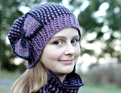 Clio is a warm winter hat and cowl, surprisingly simple to make. It is vertically striped but the colours are worked one round at a time so there is no colourwork involved. This hat doesn’t look like much but when you put it on it changes the look entirely. Also you can get completely different looks by varying the number of colours you use. More than 2 colours gives you a more scrappy looking hat and using a self striping yarn changes the hat again. It is a great hat to play around with as it works up quickly and has a unique look each time.