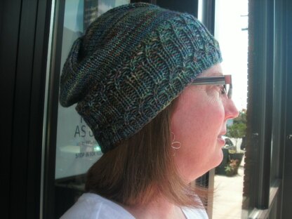 Hat #1 - Cloisters. This elegant slouch hat is perfect for a skein of variegated yarn, like Malabrigo Arroyo. It's easily adjustable by adding or deleting a pattern repeat. As written this hat will fit head sizes from 20 - 24" comfortably.