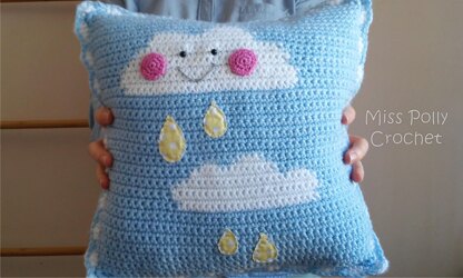 A cute and easy project to chase away the rainy day blues! It makes a cushion cover to suit a 30cm square cushion. The cover is made using mainly double crochet stitches, worked in rows, using tapestry crochet colour changes, and finished with a border of mini crochet clouds, some fabric and crochet appliques and simple embroidery. The pattern contains instructions for making the front piece to attach directly to a fabric cushion cover; alternative instructions are given for crocheting a back piece.