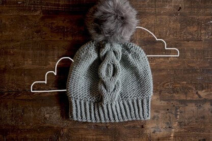 This pattern is for beginners. It has a cable design over 12 stitches only, and the rest of the stitches are a reverse of a Stockinette stitch. Available for two different sizes, Small/Medium and Large. You need a cable needle to work the cable stitches. Also, it is optional to use a pom-pom made of yarn, or a fur one.